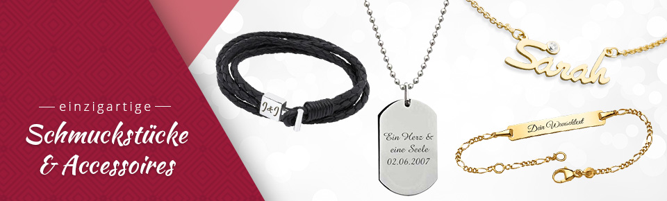 Eleganz kombiniert mit einer liebevollen Personalisierung – geht es noch romantischer? Diamonds are a girl’s best friend! Ob eine romantische Halskette, ein verspieltes Armband oder ein mit Diamanten besetzter Ring: unser personalisierter Schmuck bringt Sie ganz besonders schön zum Strahlen! Aber auch den Männern bieten wir die perfekte Möglichkeit, ihr gesamtes Outfit mit schlichten und zugleich eleganten Armbändern, Halsketten und Ringen aufzuwerten. Um unersetzlich zu sein, muss man schliesslich immer anders sein. Turteltäubchen aufgepasst: Verleihen Sie Ihrer grossen Liebe Ausdruck, indem Sie Ihrem Herzblatt kreativen und stilvollen Paarschmuck entwerfen. Diverse Accessoires wie personalisierte Portemonnaies und Schlüsselanhänger peppen Ihren Alltag in Nullkommanichts auf!